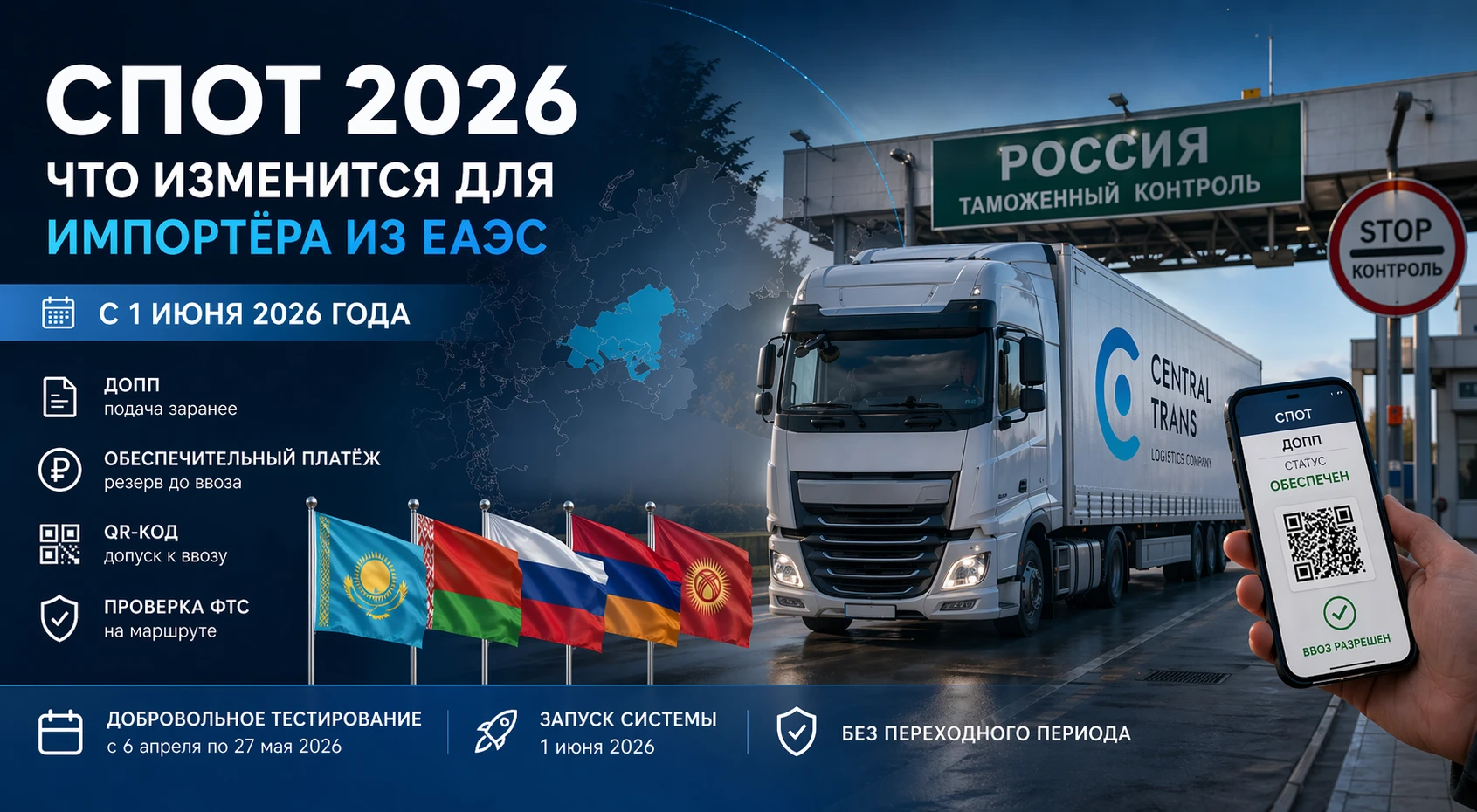 Если у вас запланирован хотя бы один ввоз из Казахстана, Беларуси, Армении или Киргизии автомобильным маршрутом, Central Trans может подключиться до выезда груза: проверить применимость СПОТ, собрать данные для ДОПП, помочь с расчётом обеспечительного платежа, подготовить перевозчика к QR-проверке и провести первый ввоз так, чтобы 1 июня прошло как обычный рабочий день.